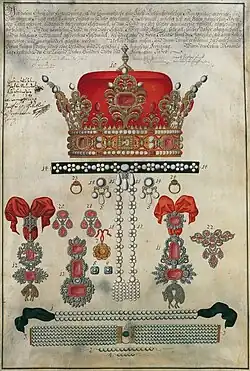 The circlet of the crown was modeled on the circlet of the Imperial Crown of Austria, while eight jeweled acanthus leaves, alternately large and small, rested on the rim of the circlet. As with the imperial crown of Rudolf II, the precious stones used in this crown were white (diamonds and pearls) and red (rubies or red spinels), which may have had some alchemist significance. Inside the crown was a red velvet cap topped with a large jeweled button.
