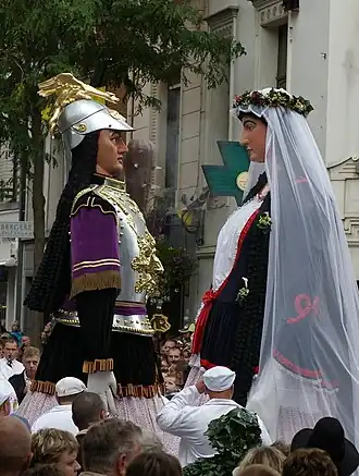 The Ducasse d'Ath is a traditional folk festival held in Ath, Hainaut, Belgium, to mark the victory of David over Goliath. The parade is held annually on the fourth Sunday of August and is characterised by the presence of processional giants depicting the horse Bayard and several other characters from local history.[1][2][3] From 2008 to 2022, it was recognised as a Masterpiece of the Oral and Intangible Heritage of Humanity by UNESCO.[4][5]