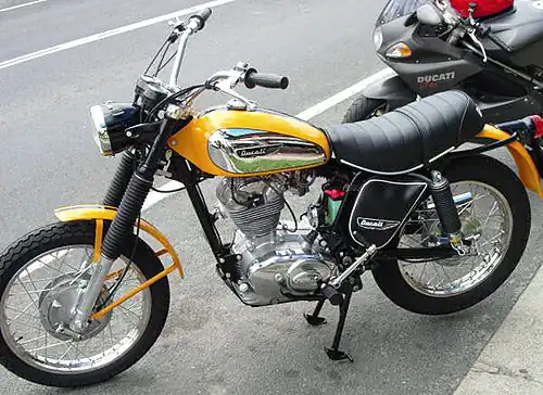 The Ducati 250 Scrambler, known in Europe as the Ducati 250 SCR[3] is an on/off-road 249 cc (15.2 cu in) single cylinder bevel drive SOHC motorcycle produced by the Italian manufacturer Ducati from 1962 to 1974. Originally produced for the American Market at the request of the US importers, Berliner Motor Corporation, the model was offered in Europe from 1968.[4] Total production was around 12,000 machines.[5]