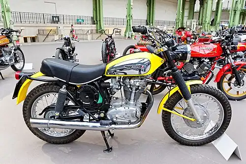 In 1968 the global market for dirt bikes was large.[7] Ducati was already producing 250 and 350 Scramblers but the American importers, Berliner Motor Corporation requested a larger-engined version to compete against the BSA 441 Victor.[8] The 450 Scrambler was introduced in 1969, and was the first model to use the 436 cc engine,[9] which was the largest displacement possible that the OHC engine could be stretched to.[10] The frame, the design of which used input from the racing department,[7] was a strengthened version of that used on the smaller scramblers with gussets along the top tube.[10]