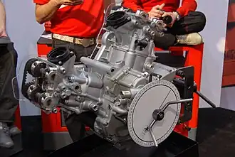 The Ducati Desmosedici RR is a presold batch of V4 race replicas. The 989cc Desmosedici engine is unique among production Ducati models for its use of gear-driven camshafts.[8]