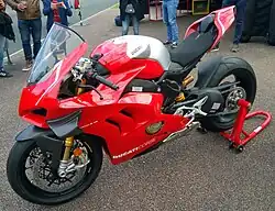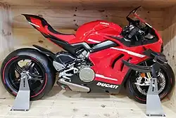 The Ducati Panigale V4 is a sport bike with a 1,103 cc (67.3 cu in) desmodromic 90° V4 engine introduced by Ducati in 2018 as the successor to the V-twin engined 1299. A smaller engine displacement version complies with the Superbike category competition regulations which state "Over 750 cc up to 1000 cc" for three and four cylinder 4-stroke engines.[3]