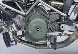 The Supermono inherited many of its features from 888 Racing. Liquid cooled double overhead cam shaft with four valve desmodromic cylinder head. A horizontally placed 550 cc (34 cu in) cylinder used a dummy connecting rod that acted like a second piston in terms of making the dynamic balance equivalent to a ninety degree Vee twin. This engineering was the key to overcoming vibration problems typically handled with either balance shafts or the incomplete solution of a crank counterweight.