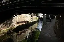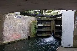 The locks on this canal have been collectively named Old Ford Three Locks,[5] all lying within the district of Old Ford, but are now individually known as Hertford Union Top, Middle and Bottom locks. They are grouped together towards the north-eastern end, and descend approximately 19 feet (5.8 m) from the Regent's Canal to the Lee Navigation. They are all single manual locks, and the largest craft that can use them have a length of 72 feet and a beam of 14 feet.[6]