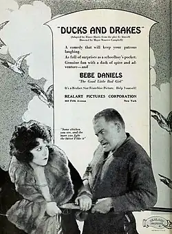 Ducks and Drakes is a 1921 American silent comedy film produced and released by Realart Pictures, an offshoot of Paramount Pictures. It was directed by stage producer/director Maurice Campbell and stars Bebe Daniels (also a producer on this film) and Jack Holt. Elmer Harris provided the story and screenplay. A copy is held at the Library of Congress.[1][2][3][4]
