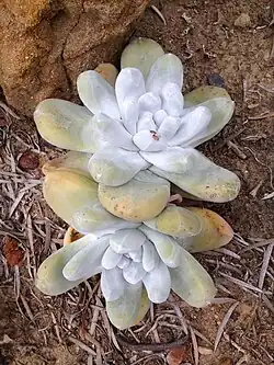 Dudleya pachyphytum is an insular succulent plant known by the common name Cedros Island liveforever. It is a member of the genus Dudleya, in the family Crassulaceae. Characterized by thick, blunt leaves covered in a white, powdery wax and adorned by white flowers in bloom, it is regarded as one of the most attractive and charismatic members of its genus. It is endemic to the foggy northern end of Mexico's Cedros Island, occupying an ecological niche shared with the Cedros Island Pine.[1][2]