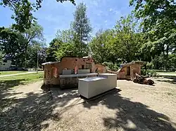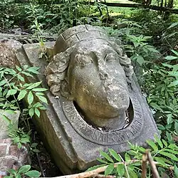 In 1998 artist Gene Threndyle in partnership with the Friends of Dufferin Grove Park created a series of gardens and a fountain marking the path of Denison Creek.[4] As part of the installation, a set of large architectural ruins were relocated from High Park to Dufferin Grove Park. These ruins were identified in 2020 by artist and amateur historian Andrew Lochhead, and confirmed by Threndyle, as the long-lost remains of the second Toronto Custom House (1876-1919) designed by Richard Windeyer.[5] The ruins, mostly keystones and some capitals, represent one of the few remaining local examples of the work of one of nineteenth century Ontario's most important and prolific architects.[6]