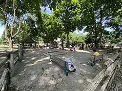 The park features a large playground, a wading pool, a pizza oven, a basketball court, and an outdoor ice skating rink in the winter. There is also an organic farmers' market at the park on Thursday afternoons from 3-7 o'clock.[1] The Park has been set up for wireless Internet usage.[2] The park is home to the Clay & Paper Theatre which stages outdoor plays in the summer as well as special events at other times of the year. Amenities include a volleyball net, ping-pong table, and skating rink. The park has trees and grass, benches and picnic tables.