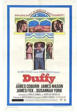 Duffy is a 1968 British-American comedy crime film directed by Robert Parrish and starring James Coburn, James Mason, James Fox and Susannah York;[2] also starring John Alderton. The screenplay was by Donald Cammell and Harry Joe Brown Jr. Originally called "Avec-Avec", French for "with-it", according to 1967 press reports, Columbia Pictures changed the title of the movie, despite the protests of the stars.[3][1]