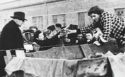 The refugees brought to the camp had to jump off the wagons amidst shouts and pushes, as there were no platforms at the Pruszków siding. Then, amidst a corridor of Germans, they were driven into one of the nine production halls. Guards were unallowed to assist the sick, injured, or elderly when disembarking from the wagons or carrying loads. Only Polish personnel recruited by the Central Welfare Council could do this, but their numbers were too few considering the size of the transports.[74] The halls where the refugees were placed were surrounded by barbed wire and supervised by German posts.[75] Leaving the halls was prohibited, so only Polish personnel could move relatively freely within the camp.[76] There were incidents where people standing too close to the fence were harassed by dogs. German agents and military patrols searched the crowd of refugees for hidden Home Army soldiers.[77]