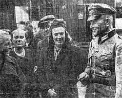 On 18 September 1944, a two-person delegation from the International Red Cross, led by Dr. Paul Wyss (a Swiss citizen), arrived at the camp. The Germans then improvised a comfortable transport for the refugees.[64] Passenger cars were waiting on the platforms, some halls were cleaned up (with part of the population removed in advance), and the prisoners were given better meals. Dr. Jadwiga Oszkielowa, who despite threats from the Germans presented the Red Cross delegates with the true situation of the refugees, was punished by having her access card to the camp revoked. She was also threatened with arrest.[66] After the departure of the Red Cross representatives, the situation in the camp returned to its previous state.[67]
