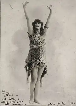 Deamer was known as the "Queen of Bohemia" due to her involvement with Norman Lindsay's literary and artistic circle, the Bohemian world of Kings Cross, Sydney, and vaudeville.[5] During the inter-war years, many balls were held in Sydney, including those known as the "Artists' Balls" which had been held as far back as the 1880s. Dulcie Deamer attended every Artists' Ball for 30 years.[6] The leopard-skin costume with dog-tooth necklace that she wore to the 1923 Artists' Ball in Sydney "has come to symbolise the joie de vivre of the decade, despite Deamer's own protest regarding its relevance."[6][7]