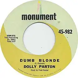 "Dumb Blonde" is a song written by Curly Putman and recorded by American singer-songwriter Dolly Parton. It was released as a single on November 7, 1966, by Monument Records. It would be included on Parton's 1967 debut album, Hello, I'm Dolly. It was Parton's first song to chart on the Billboard Hot Country Singles chart, peaking at number 24. Parton re-recorded the song with Miranda Lambert in 2018 for the Dumplin' soundtrack album.