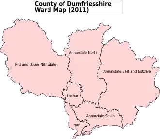 The electoral wards in the Dumfriesshire constituency are listed below. All of these wards are part of Dumfries and Galloway:[2]