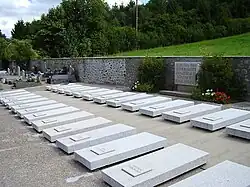 After the Germans left, villagers discovered the bodies of the hostages. Most lay on the church porch, while the priest's body was found in the church tower. He had reportedly been hung from the belfry and later cut down.[5] Other victims were found on nearby roads or in neighboring villages. In total, 27 people were killed in the massacre. Their funeral was held on 1 July 1944.