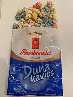 The Dunakavics confectionery produced by Bonbonetti[8][9] consists of roasted peanuts coated in a colorful sugar shell. This candy is made up of 46% sugar, glucose syrup, various colorings, a glazing agent, flavoring, and a small amount of hazelnut.[10]