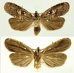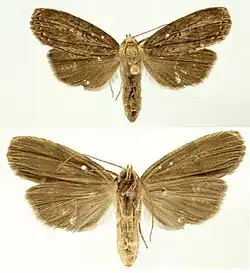 The length of the forewings is 10.7–13.3 mm. The forewing dorsal ground color is a mixture of gray-brown, reddish-brown and beige-colored scales. The veins are lined with gray, especially distally. The anal fold and cubitus are reddish brown and the orbicular spot is diffuse reddish brown. The reniform spot is small and reddish brown. The ventral surfaces of both wings are gray brown and the dorsal hindwing is dirty gray brown, but lighter near the base.