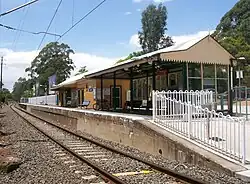 The platform is brick faced with pedestrian access at grade by crossing an operational railway line. Modern lighting, information signs and fencing is located in appropriate areas on the platform and around the station. A commuter carpark is located on the Station Street side of the station.[3]