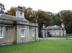 The Tower lodges and gates at Loch of Skene are also category A listed.[20] Several other structures within the estate are designated category B including the lodges.[21] The formal gardens are sited to the west and south of the mansion and feature two large terraces designed by Aston Webb in the early 20th-century.[8]