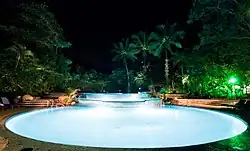 The damage to the resort was described as being very severe, with much of the resort needing to be completely rebuilt. The usually cyclone-hardy palm trees were stripped.[46] The resort's pool was filled with sand from the storm surge, the function hall was gutted, and the health centre was unroofed. Almost all of the beachfront apartments had their walls torn off.[47] The gardens of the resort were stripped bare.