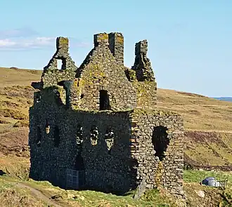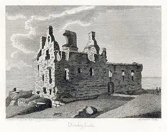 The three-storey L-plan structure is sited on a promontory, with a rock-cut ditch, 15 metres (49 ft) wide by 2.5 metres (8.2 ft) deep, defending the only access, from the north-east.[3] The castle measures 30 by 14.3 metres (98 by 47 ft), with walls 1.5 metres (4.9 ft) thick, although the building is now a roofless shell. The north-east wing is of a later date, and the foundations of a south range are visible. Near the castle are the remains of a watchtower, 7 metres (23 ft) square, built on the cliff edge.[4] Timothy Pont's map drawn c. 1580 – 1590 shows Dunskay Castle with 2 watchtowers on the cliff edge fronting the sea.[5] Francis Grose's drawing dated show of 10 May 1790s the ruins of the foundations and sea-wall on the south, and what looks to be the large entrance door in the southern corner from where the inside staircase may have led straight up to the new "Hall" built c.1520. Grose's drawing shows Ireland (approx. Island Magee / Larne area) in the background across the sea.[6]