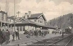 The Central Pacific Railroad had constructed their rail line up the Siskiyou Trail by 1886, and the settlement of Pusher was founded near Upper Soda Springs as a town to support rail operations in the area. The first Dunsmuir stop was simply a boxcar located lower on the line further to the south than the current town. In January 1887, the Dunsmuir station was moved to the railroad's engine house while retaining the name, whereupon the town also adopted the moniker.[4]
