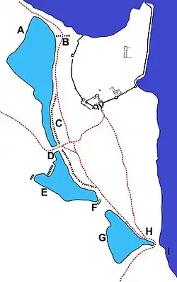The North Mere is 5.6 acres (2.3 hectares) in area, and is blocked off on its northern end by a sod-cast bank, adjacent to the site of the North Gate.[87] The southern half takes the form of a 331-foot (101 m) long moat, which was recorded as being 18 feet (5.5 m) deep in the medieval period, terminating in the West Gate.[88] The northern part of this mere occasionally floods in the 21st century, creating a temporary lake, and the moated section usually still contains some standing water.[89] The West Mere, covering 2.25 acres (0.91 hectares), stretches away from the location of West Gate and is blocked at the far end by a small, stone dam.[90] Three rectangular fishponds were built alongside the West Mere, the smallest, probably a stew pond for raising young fish, being fed with water from the lake.[91] A protective earthen bank, probably originally reinforced by a timber palisade, ran for approximately 490 feet (150 m) along either side of the West Gate, where a gatehouse was probably built.[92] At the far end of the lake complex was the South Mere, 2.25 acres (0.91 hectares) in size, with the South Gate positioned in its eastern corner.[83]