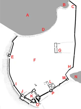 - ^ There are historical references in 1543 to a former wall running along the north side of the castle, but it was already being described as having been eroded by the sea many years before, and the assertion that it originally existed may not be authoritative. It is also uncertain whether this statement referred to a defensive curtain wall, of which no trace remains, or a simpler wall to protect livestock. Some erosion of the cliffs has occurred since the castle was first built, but little has occurred since 1861 and it is far from certain that sufficient erosion would have taken place to have destroyed any original walls.[102]