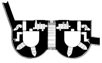 The passageway through the gatehouse was protected by a portcullis and possibly a set of wooden gates.[110] The ground floor contained two guardrooms, each 21-foot (6.4 m) wide, and latrines, with spiral staircases in the corner of the gatehouse running up to the first floor, where relatively well-lit chambers with fireplaces probably accommodated the garrison's officers.[111] The staircases continued up to the second floor, containing the castle's great hall, an antechamber, and bedchamber, originally intended for the use of Thomas of Lancaster and his family.[112] Four towers extended above the gatehouse's lead-covered roof for an additional two storeys of height, giving extensive views of the surrounding area.[113] This design may have influenced the construction of Henry IV's gatehouse at Lancaster Castle.[114]