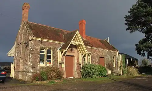 The station is located one mile from the village of Dunster, which contains many historic buildings. The stone station building and platform is on the south side-west of the line, its imposing design reflects its former status as the station for distinguished visitors to Dunster Castle. It is a Grade II listed building.[3] A goods shed was provided on the opposite side of the line, and this building and surrounding yard are now used as a workshop and base for the WSR's Permanent Way (civil engineering) department.[2]