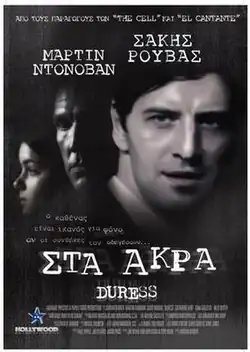 Duress is an American psychological thriller film. The film was initially screened at various film festivals in the United States, Poland and Russia and received favorable reviews.[1][2] Mark Savlov of the Austin Chronicle wrote about Duress after seeing it at Fantastic Fest in Austin: "With a mind-blowing denouement that makes the last five minutes of The Sixth Sense feel like the last five minutes of Stranger Than Paradise and a pair of harrowing, human (and inhumanly calibrated) performances from Martin Donovan and Rouvas, Duress comes across like a slap to the psyche, a splash of ice-water across the soul." The film was released theatrically in Greece by Greek distributor Hollywood Entertainment.[3][4]