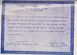 - ^ "Official Listing(Oriya) of Sahitya Akademi Award winners to writers in Oriya language". Archived from the original on 8 October 2011. Retrieved 10 June 2011.