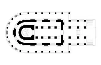 The Durga temple has an apsidal plan for its sanctum, one that fuses with a square plan for the mandapa. This design seems to have borrowed influences from early apsidal Buddhist Chaitya Caves such as the Karla Chaitya.[12]