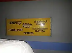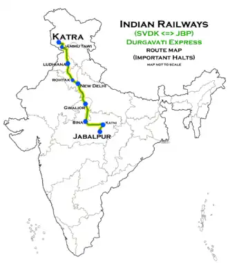 It operates as train number 11449 from Jabalpur Junction to Shri Mata Vaishno Devi Katra and as train number 11450 in the reverse direction, serving the states of Madhya Pradesh, Uttar Pradesh, Haryana, Delhi, Punjab and Jammu and Kashmir.[2]
