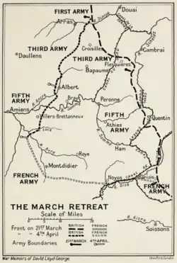 The Dury, Compiègne and Abbeville meetings were held by the Allies during World War I to address Operation Michael, a massive German assault on the Western Front on 21 March 1918 which marked the beginning of the Kaiser's Spring Offensive. Since the fall of 1917, a stalemate had existed on the Western Front. However, German victory against Russia in 1917, due to the Russian Revolution and the signing of the Treaty of Brest-Litovsk, freed up German armies on the Eastern Front for use in the west. During the winter of 1917-1918, approximately 50 German divisions in Russia were secretly transported by train to France for use in a massive, final attack to end the war.[1][2] The battle that followed, Operation Michael, totally surprised the Allies and nearly routed the French and British armies from the field.[3] The meetings below were held under these dire circumstances.