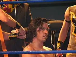 After a successful title defense against Drake Younger,[24] Taylor put the cup on the line against Ricochet on August 18 at the 2007 International Invaders weekend, with Ricochet putting his career on the line. Taylor would win the match, seemingly ridding his rival for good.[25] However, Taylor's momentum would come to a halt after he was eliminated in that years Torneo Cibernetico match by Lince Dorado.[26] A month later, he was defeated by Claudio Castagnoli in singles competition at the October 26 event Bruised.[27] Later that night, Taylor replaced an inactive Icarus to team with Akuma in a Campeonatos de Parejas title defense against Incoherence (Delirious and Hallowicked), which Taylor and Akuma lost.[27] The next night, Taylor lost his Young Lions Cup to the debuting newcomer, Helios, who bore a striking resemblance to Ricochet.[28] However, Taylor managed to regain some success before the end of 2007 by defeating Shane Storm and Passion Hasegawa, respectively in singles matches before teaming up with Team F.I.S.T. to beat the team of Tim Donst and Los Ice Creams (El Hijo del Ice Cream and Ice Cream, Jr.).[29][30][31]