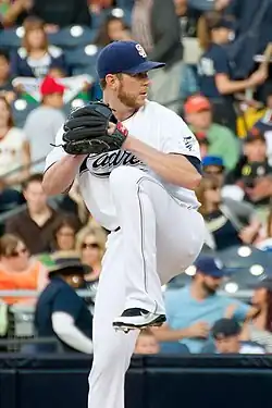 After the 2010 season, Moseley signed a one-year contract with the San Diego Padres.[7] He struggled during the season partly due to a lack of run support. On July 26, he dislocated his left shoulder after getting a base hit, which ended his season with a 3–10 record and 3.30 ERA (a career best) in 120 innings.[8][9] On May 7, 2012, Moseley was again placed on the disabled list due to labrum damage in his right shoulder.