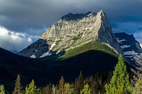 Dusty Star Mountain (8,573 feet [2,613 m]) is located in the Lewis Range, Glacier National Park in the U.S. state of Montana.[3] Connected by an arête to Citadel Mountain to the south, Dusty Star Mountain lies to the south and across the Saint Mary Valley from Going-to-the-Sun Mountain. Dusty Star Mountain is easily seen from the Going-to-the-Sun Road, and often photographed by tourists taking pictures of Wild Goose Island which lies in the western section of Saint Mary Lake. The Blackfoot name for Dusty Star is iszika-kakatosi meaning "meteor" or "smoking star".[4]