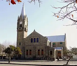 The Dutch Reformed Church in Barkly East is the 72nd-oldest congregation of the Dutch Reformed Church[1] in what was the Cape Church for more than a century and a half, before the establishment of the Synods of Western and Southern Cape,[2] Eastern Cape and Northern Cape in the middle of the decade after 1970 and beyond.[3] It was indeed the 76th congregation to be founded, but four congregations that were older than Barkly East have since been incorporated into neighboring congregations,[4] namely Middelburg (1852, no. 41), Komga (1859, no. 63), Greykerk (1862, no. 65) and Alice (1862, no. 66), all in the present NG Church in the Eastern Cape. In 2016, the congregation had 263 professing and 90 baptized members. Besides the main church on Barkly East, the village of Rhodes is also a ministry point of the congregation.[5]