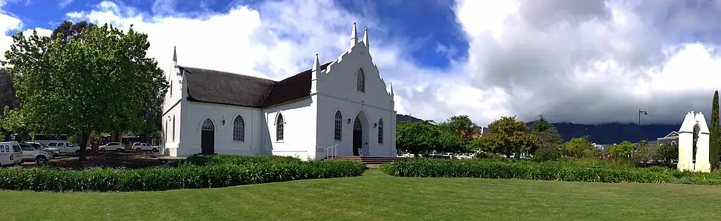 The Dutch Reformed Church is a Dutch Reformed church in Franschhoek, South Africa. The church was built in 1847 and is situated on the main road running through the town. This valley, tightly hemmed in by mountains, is named after the French Huguenots who fled to the Cape after religious persecution in 1688. They brought with them knowledge of viniculture and settled to make wine.
