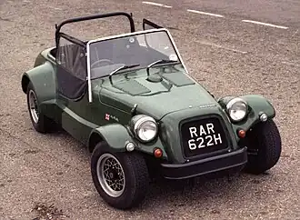 Lotus 7-like car based on MG Midget mechanical parts, aluminium body panels, glass-fibre wings |