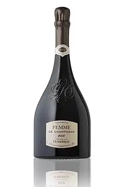 Her first decision was to find a new name for the prestige cuvee envisioned by her late husband. She decided to call it “Femme de Champagne” (Woman of Champagne) as a reminder of the company’s new identity, being run by a woman, and because champagne is naturally thought of as feminine wine. Made from 85% chardonnay and 15% pinot noir, exclusively grown in Grands Crus areas, Femme de Champagne is often described as an elegant and delicate, therefore feminine champagne.[24]