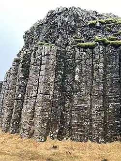 Dverghamrar (also known as "Dwarf Cliffs" or "Dwarf Rocks")[2] is a geological formation in Southern Iceland, consisting of columnar jointing of volcanic rocks. The formation appears as vertical, hexagonal columns of varying heights. Situated off the Ring Road in the town of Kirkjubæjarklaustur, the cliffs are a popular destination for tourists.[3]