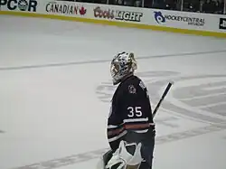 A Hobey Baker Award nominee and National Collegiate Athletic Association All-American while tending goal for University of Massachusetts Lowell, Roloson went undrafted after graduating. He was signed as a free agent by the NHL's Calgary Flames in 1994. After splitting time between the Flames and their American Hockey League (AHL) counterpart, the Saint John Flames, he was signed as a free agent by the Buffalo Sabres to back up Dominik Hašek.[2] Following two years with the Sabres, he was picked up in the 2000 NHL expansion draft by the Columbus Blue Jackets.[3] Rather than joining the Blue Jackets, Roloson signed with the St. Louis Blues and spent the entire season with their AHL affiliate, the Worcester IceCats.[4]