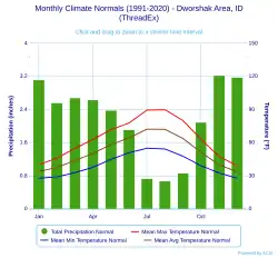 Dworshak's climate is classified as Warm-summer Mediterranean climate (Köppen Csa). Among them, the annual average temperature is 51.7 °F (10.9 °C), the hottest month in July is 72.2 °F (22.3 °C), and the coldest month is 33.3 °F (0.7 °C) in December. The annual precipitation is 26.10 inches (662.9 mm), of which November is the wettest with 3.23 inches (82.0 mm), while August is the driest with only 0.68 inches (17.3 mm). The extreme temperature throughout the year ranged from −22 °F (−30 °C) on January 21, 1937 to 118 °F (48 °C) on July 28, 1934.