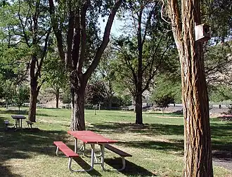 The grounds are named for J.W. Dyer, who gave the land to the state in 1931.[2] In 1997, a group of volunteers called Dyer Partners renovated the park, which had become "an overgrown weed patch with rotting picnic tables".[4] They trimmed locust trees, built fences, repaired picnic tables, and planted fruit trees. The federal Bureau of Land Management donated two surplus toilets in 1999 and the Oregon Parks and Recreation Department built vaults for the toilets. In 2000, OPRD installed an irrigation system and Gilliam County road crews made pathways and improved the parking lot.[4] In 2004, the group, whose numbers were said to be "dwindling," made another stab at improving the site. With assistance from personal from Deschutes State Park, they aimed to make connections with water pipes installed two years earlier.[3] As of 2016, the park's sole textual reference (as Dyer State Park) on the Oregon State Park's website was as a place where metal detecting can be pursued.[5]