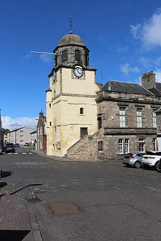 The first municipal building in the town was a tolbooth tower erected in 1567. This does not appear to have been successful as it was demolished, just eight years later, in 1575, and replaced by the present three-stage tower, which was built in harled stone and erected slightly to the south of the original structure, in 1576.[2] The first stage of the tower contained a doorway, while the second and third stages were originally blind, although a clock was installed in the third stage in 1592.[1] There was a round stair-tower at the northeast corner of the building which provided access to the upper levels, and the building was extended to create a prison in 1617:[3] five women were accused of witchcraft and incarcerated there in 1630.[4]