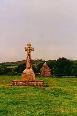 The cross was re-erected in 1871 by Francis Hutcheson Synge of Dysert.[6] The shaft of the cross is 6.2 by 2.1 feet (1.89 by 0.64 m) and the head is 3.5 feet (1.1 m) high. The north and south sides of the cross are cut into patterns. The north side includes a crude carving of two men swearing on a staff between another man and a bishop. The west side has two heads, but otherwise the carvings have been broken off. The east side has a figure of Christ, with outstretched arms. Below that is a large figure of Saint Tola of Clonard, the Bishop of Clonard and the founder and patron of the Dysert church. Tola died between 733 and 737.[6]