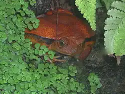 Females are much larger than males, reaching up to 10.5 cm and 230 g in weight (6.5 cm and 41 g for males).[3] Tomato frogs live up to their name by possessing a vibrant, orange-red colour.[4] Females have brighter tones of red or orange on their back, with a pale undersurface.[5] Some individuals also have black spots on the throat.[4] It is thought that the brilliant colours of the tomato frog act as a warning to potential predators that these frogs are toxic;[6] a white substance secreted from the skin acts as a glue to deter predators (such as colubrid snakes) and can produce an allergic reaction in humans.[4][5]