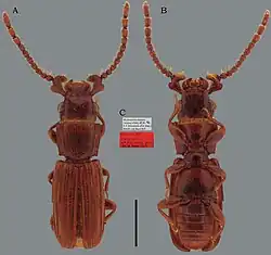 The specific epithet derives from Latin calyx (meaning chalice) and cornis (meaning horn, antenna) and refers to the male antennal scape, which is caliciform in dorsal view.[1]